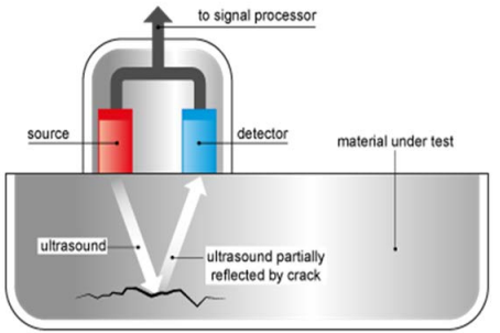 reflections occur at the crack. The time for these to return is used to determine the depth of the crack.