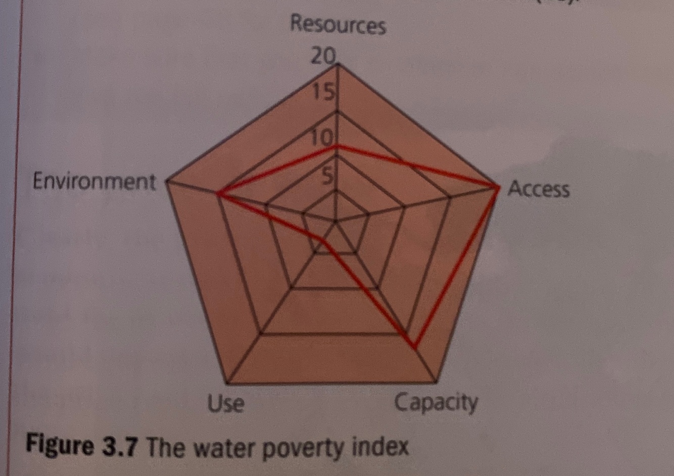 Each of the parameters is scored out of twenty to give a maximum possible score of 100. Figure 3.7 shows the water poverty index. The red line illustrates how a country’s score would be presented.