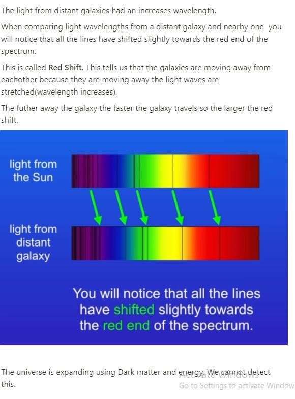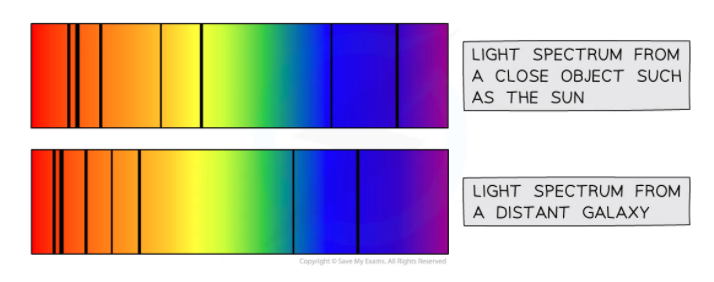 Red-Shift - observed increase in Wavelength of light from distant galaxies so frequency decreases. The further away the galaxies, the faster they are moving and the bigger the observed increase in wavelength. This effect is called red-shift.