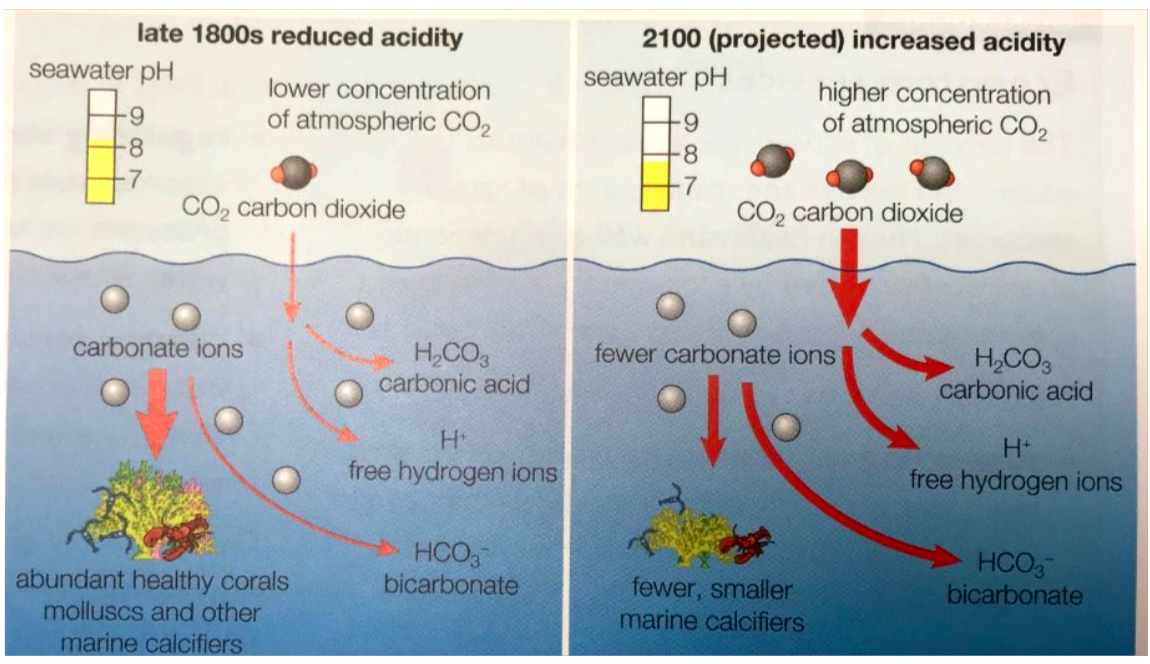 Marine photosynthetic organisms and animals such as corals, make shells and plates out of calcium carbonate (CaCO3). This process of ‘calcification’ is massively affected the less alkaline there is in the oceans.