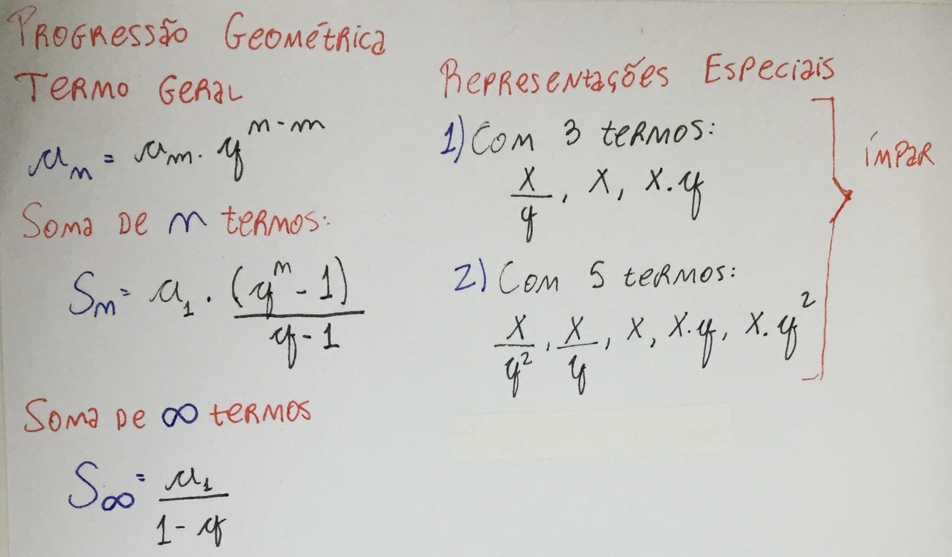 Como é o termo geral, a soma de n termos, a soma de infinito termos, e as representações especiais com 3 e 5 termos da progressão geométrica?