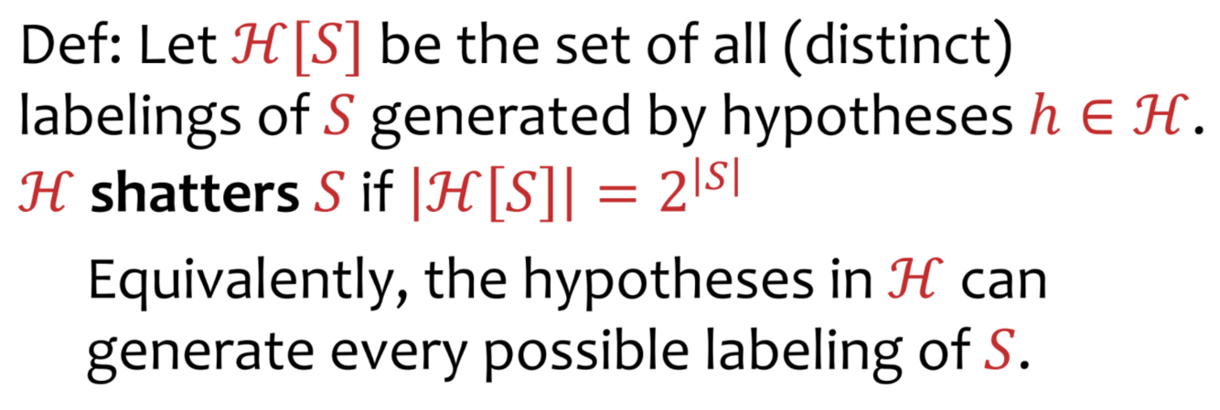 Def: The VC-dimension (or VaporikChervonenkis dimension) of ℋ is the cardinality of the largest set “ such that ℋ can shatter “.