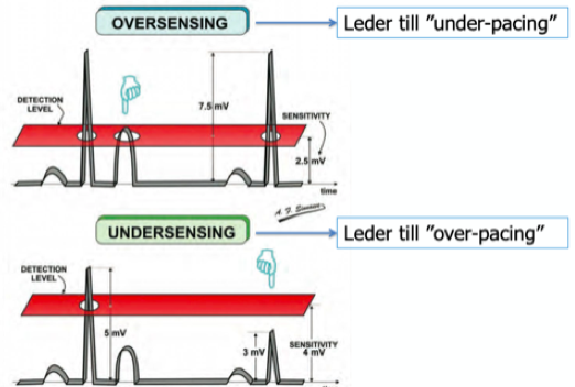 Oversensing innebär att känsligheten på pacemakern är för hög och den kan då missta en T-våg för en R-våg och då tror pacemakern att frekvensen är högre än vad den är.