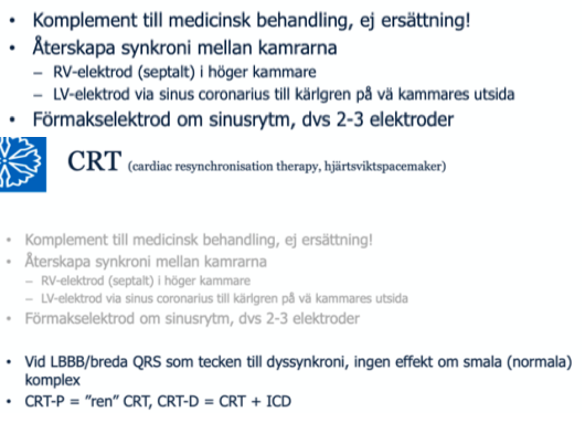 CRT är likt pacemaker och ICD men skillnaden är att CRT hjälper till att synkronisera patientens hjärtslag för att förbättra den kardiella funktionen hos patienten. Man ger detta till patienter med hjärtsvikt som ju har minskad kardiell funktion. Man brukar kalla CRT för hjärtsvikts-pacemaker