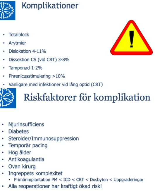 Vilka komplikationer kan uppstå för patienter som har pacemaker/ICD/CRT och vad är riskfaktorerna för att dessa komplikationer ska uppstå? (5p)