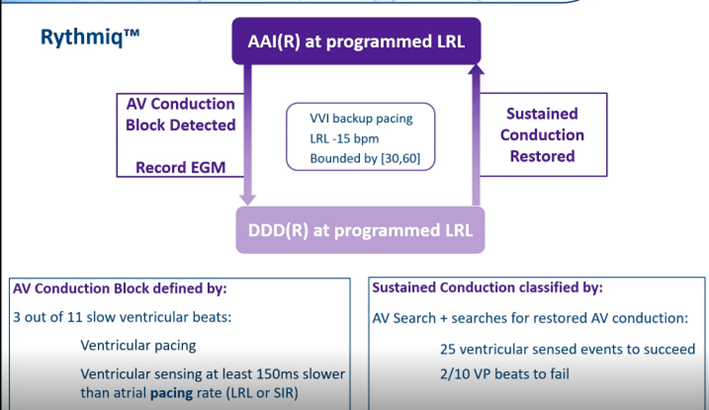 Search AV + :promotes intrinsic AV by periodically extending the Av delay to the programmed AV Search + value and if a V-sense detected within 8 cycle search ventricular hysteresis (VS-Hy) continues and if VS-Hy >=25 beats the device switches to AAI with back up VVI mode (RythmIQ); if no intrinsic conduction is detected within the 8 cycle search period or 3 out of last 10 beats are VP the device remains in DDD mode for another certain amount of intervals (Search interval: number of intervals before Search AV delay occurs - can be programmed from 32-1024 intv). Therefore Search AV + works in combination with RythmIQ