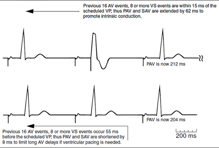 Search AV + : the device assesses 16 AV conduction intervals and determines if the 8 or more VS are within 15 ms of the schedules VP, the PAV and SAV are extended by 62 ms to promote intrinsic conduction. If 8 or more VS events (within the last 16 intervals) occur 55 msec before the scheduled VP, PAV and SAV are shortened by 8 msec to limit long AV delays if VP is needed.