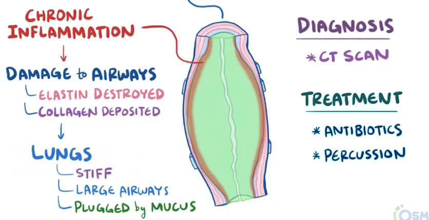 Def: obstructive lung disease characterised by permanent dilation of bronchi from the destruction of elastic & muscular components of the bronchial wall