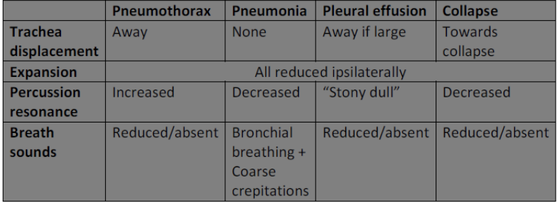 Pleural effusion, pneumothorax, lung collapse, lung fibrosis, consolidation on resp exam?
