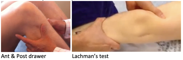 Special tests = 3Cs of knees – Cartilage (McMurray’s), Collaterals, Cruciates – Lachman’s, A/P-drawer)