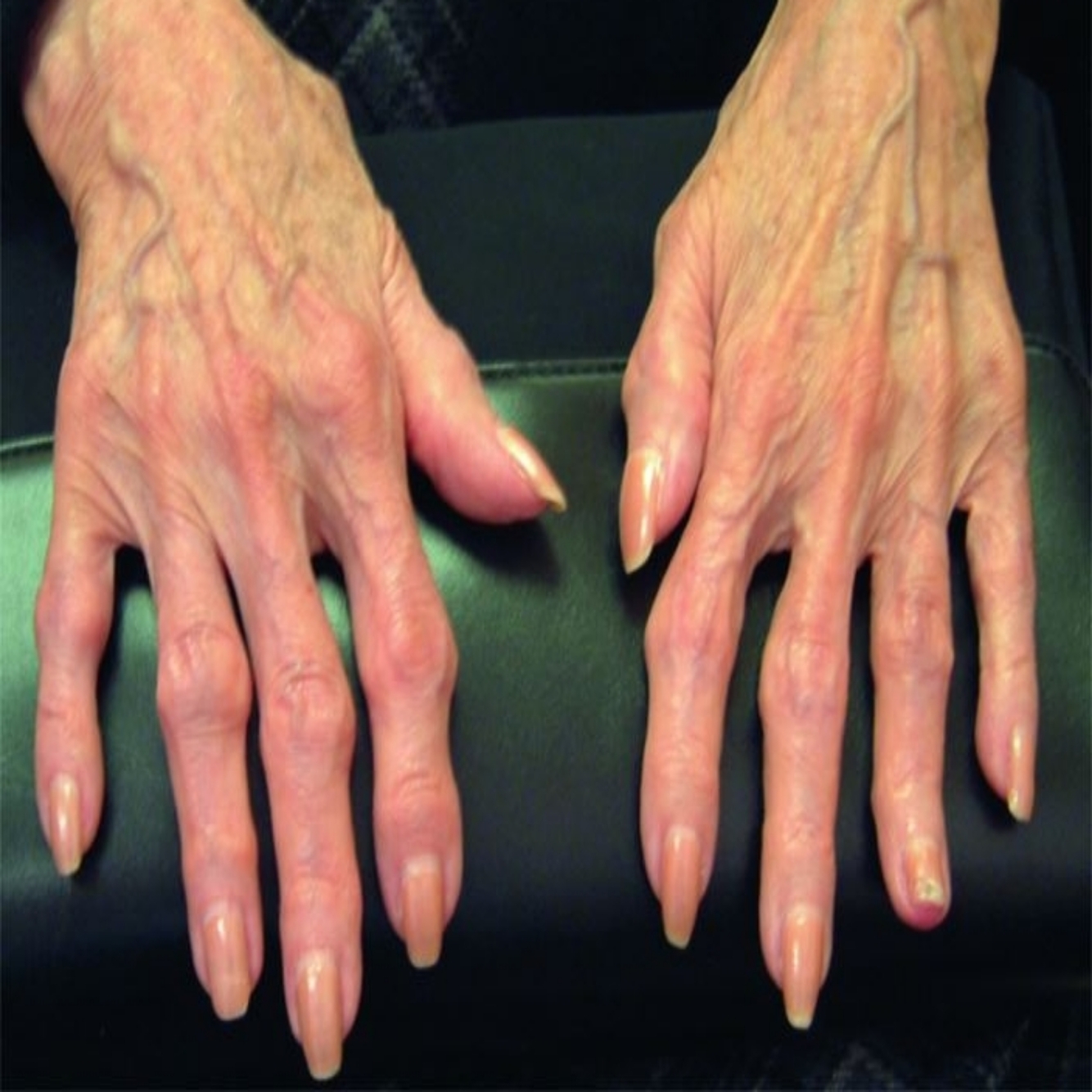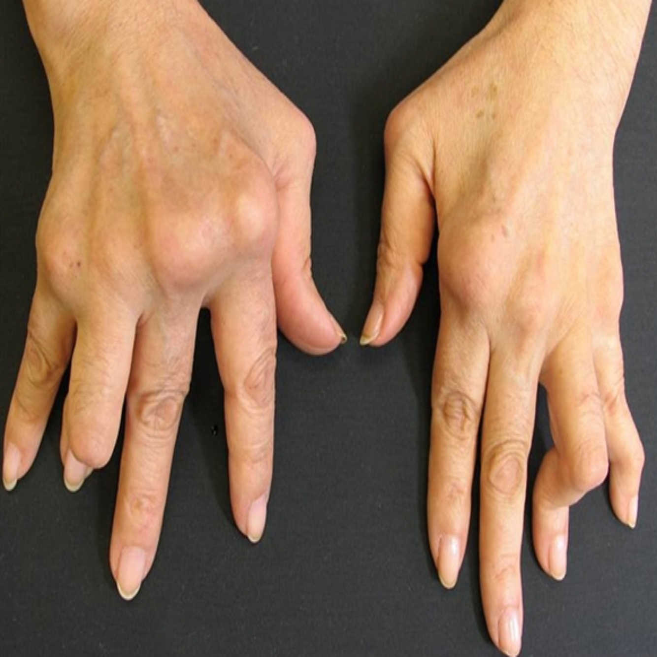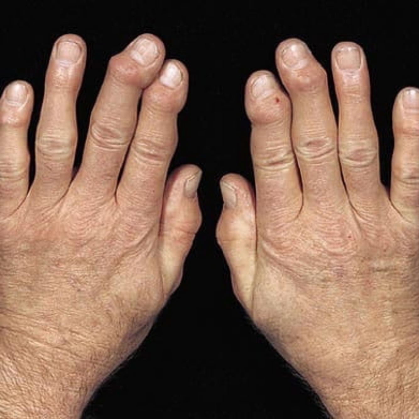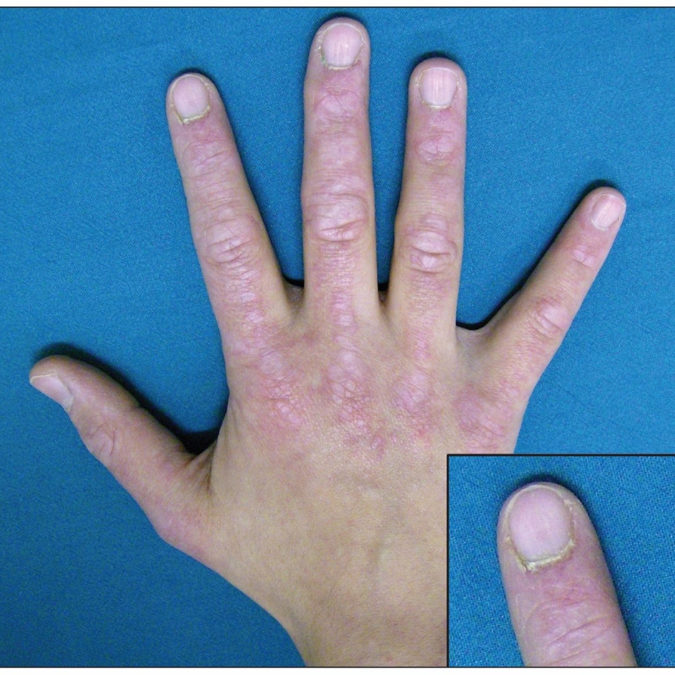 (More classically on extensor surfaces eg elbow, but I have used a picture of the hand so as not to give it away so obviously)