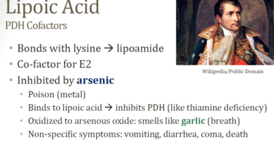 What does lipoic acid bind to? What is it a co factor for? What is it inhibted by?