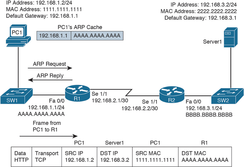 Step 1. PC1 compares its IP address and subnet mask 192.168.1.2/24 with the destination IP address 192.168.3.2. PC1 determines the network portion of its own IP address. It then compares these binary bits with the same binary bits of the destination address. If they are the same, it knows the destination is on the same subnet. If they differ, it knows the destination is on a remote subnet. PC1 concludes that the destination IP address resides on a remote subnet in this example. Therefore, PC1 needs to send the frame to its default gateway, which could have been manually configured on PC1 or dynamically learned via DHCP. In this example, PC1 has the default gateway address 192.168.1.1 (that is, R1). To construct a proper Layer 2 frame, PC1 needs the MAC address of the frame’s destination, which is PC1’s default gateway in this example. If the MAC address is not in PC1’s Address Resolution Protocol (ARP) cache, PC1 uses ARP to discover it. Once PC1 receives an ARP reply from router R1, PC1 adds R1’s MAC address to its ARP cache. PC1 then sends its data destined for Server1 in a frame addressed to R1.