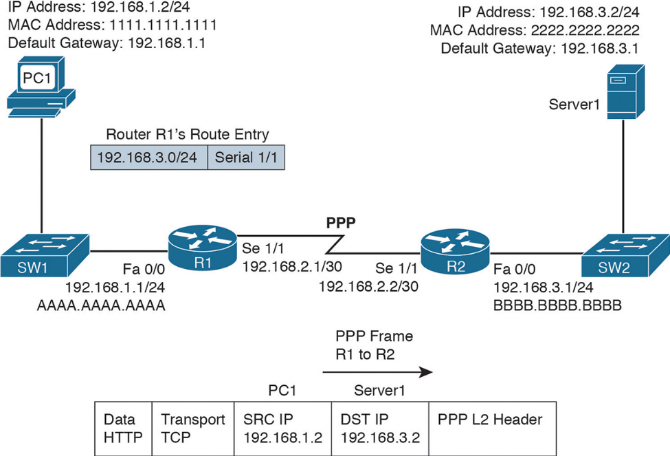 Step 2. R1 receives the frame sent from PC1, and because the destination MAC address is R1’s, R1 tears off the Layer 2 header and interrogates the IP (Layer 3) header. An IP header contains a time-to-live (TTL) field, which is decremented once for each router hop. Therefore, R1 decrements the packet’s TTL field. If the value in the TTL field is reduced to zero, the router discards the packet and sends a time-exceeded Internet Control Message Protocol (ICMP) message back to the source. Assuming that the TTL is not decremented to zero, R1 checks its routing table to determine the best path to reach the IP address 192.168.3.2. In this example, R1’s routing table has an entry stating that network 192.168.3.0/24 is accessible through interface Serial 1/1. Note that ARP is not required for serial interfaces because these interface types do not have MAC addresses. Therefore, R1 forwards the frame out its Serial 1/1 interface, using the Point-to-Point Protocol (PPP) Layer 2 framing header.