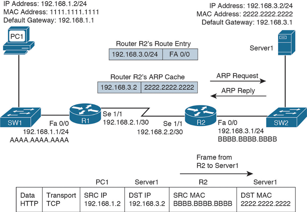 Layer 3-to-Layer 2 mapping table: R2’s ARP cache contains Layer 3-to-Layer 2 mapping information. Specifically, the ARP cache has a mapping that says MAC address 2222.2222.2222 corresponds to IP address 192.168.3.2. An ARP cache is the Layer 3-to-Layer 2 mapping data structure used for Ethernet-based networks, but similar data structures are used for Multipoint Frame Relay networks and Dynamic Multipoint Virtual Private Network (DMVPN) networks. However, for point-to-point links such as PPP or High-Level Data Link Control (HDLC), because there is only one other possible device connected to the other end of the link, no mapping information is needed to determine the next-hop device.