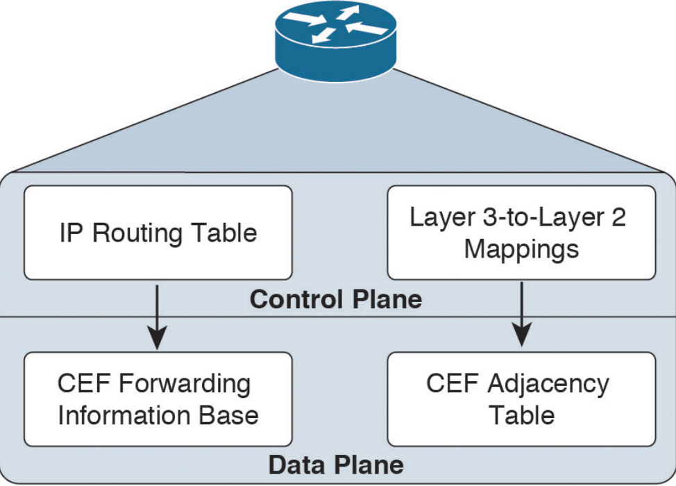 If the observed behavior of the traffic is not conforming to information in the IP routing table, remember that the IP routing table is maintained by a router’s control plane and is used to build the tables at the data plane. CEF is operating in the data plane and uses the FIB. You need to view the CEF data structures (that is, the FIB and the adjacency table) that contain all the information required to make packet-forwarding decisions.