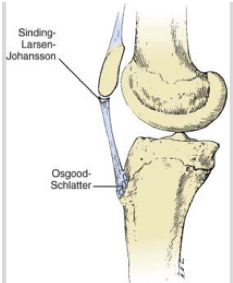 osgood-schlatter disease = inflammation of tibial tubercle apophysis, most common sinding-larsen-johanssen = inflammation of inferior pole of patella