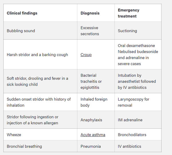 Management of paediatric emergencies is A-E approach as it is with adults; what could the following clinical findings indicate in a child: