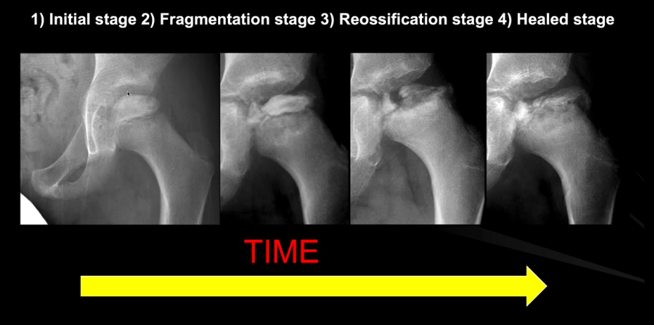 How is perthes disease staged on an x-ray?