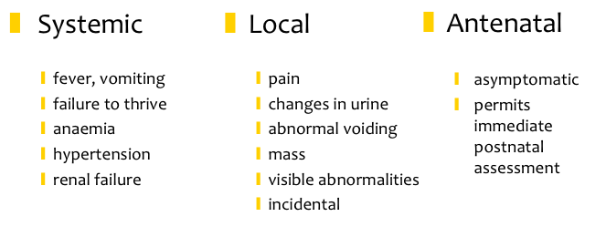 Presentations of Paediatric Urological problems: what things may they present with systemically, locally, and antenatally?