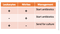 Treatment: 5 days: Cefalexine trimethoprim, nitrofurantoin amoxicillin. (Depends on culture)