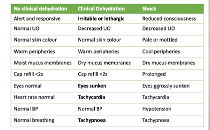 Examine for signs of dehydration and fever, abdominal distention, hernia orifices and genitalia. Weight is a big determinant of dehydration as clinical dehydration is usually 5-10% weight lost and shock is >10%.