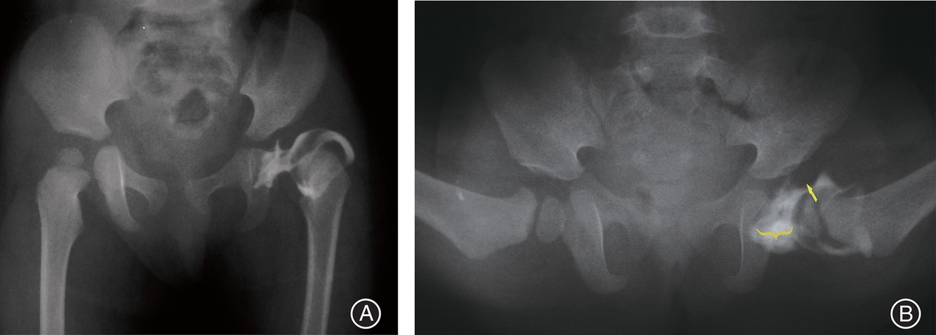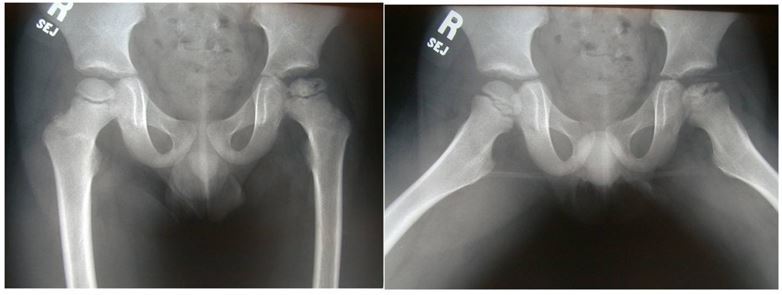 Pelvic radiograph of a skeletally immature child with dislocated left hip due to DDH as evidenced by