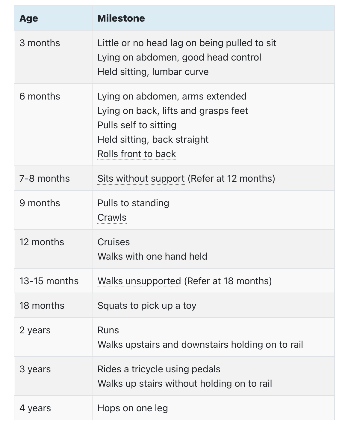 Gross motor developmental milestones?