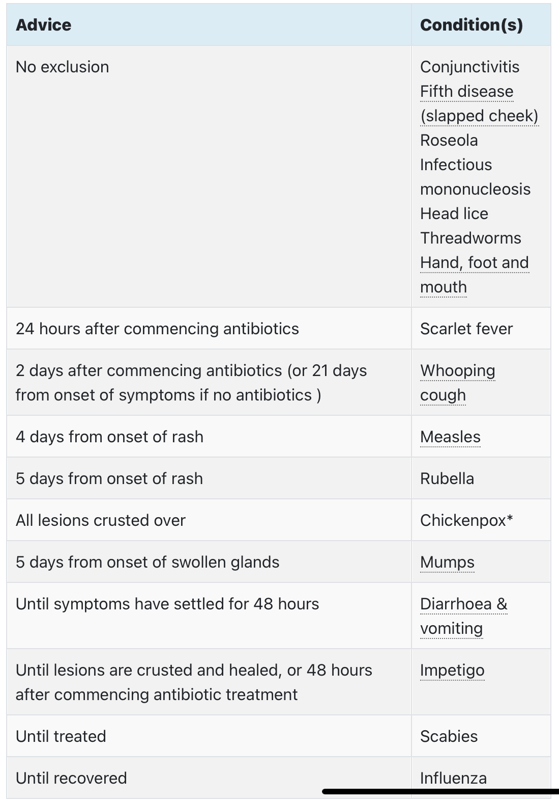 School exclusion advice for infectious diseases?