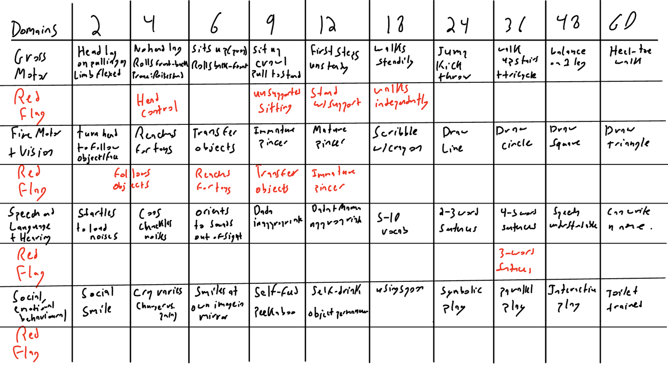 Developmental milestones (There is a deck of 10 cards in paeds for it). Answer has the table. Take a look and move from 1-5.