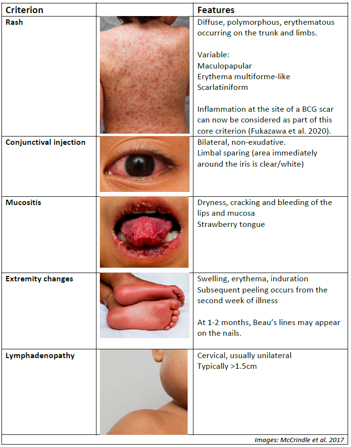 - Oral changes (strawberry tongue, fissured lips, pharyngeal erythema)