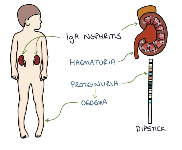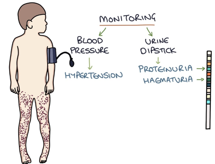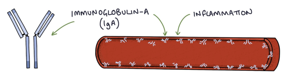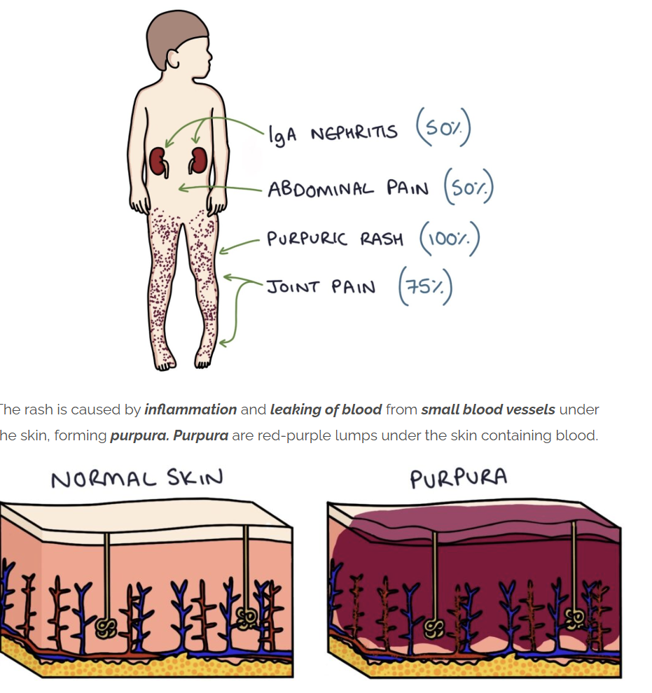 IgA vasculitis - purpic rash lower limbs > buttocks, inflammation and blood leak from small blood vessels