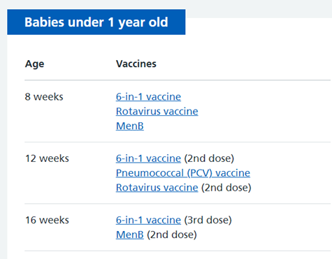 Dicuss what vaccinations are offered to children in the first 4 months- include at what age they are offered each