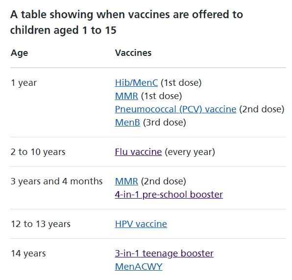 Discuss what vaccinations are offered to children aged 1-15 years