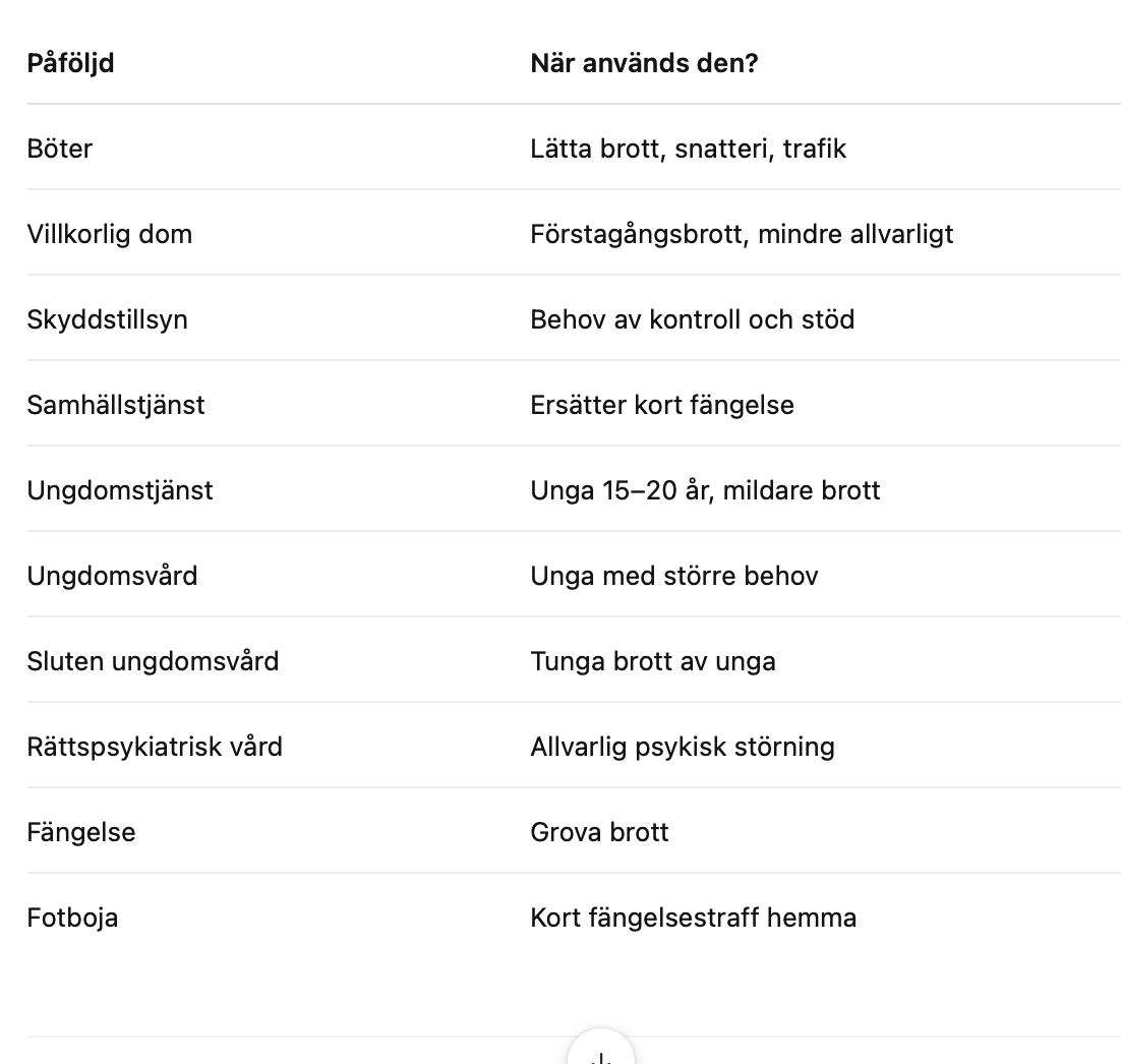 Det finns olika påföljder som man kan dömas till i Sverige. Berätta om dem här nedan, skriv tydligt/utförligt.