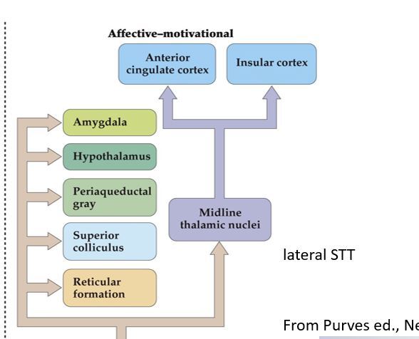 2- posterior thalamus (VPI and VMpo) which innervates the rostral insula [emotion, unpleasantness].