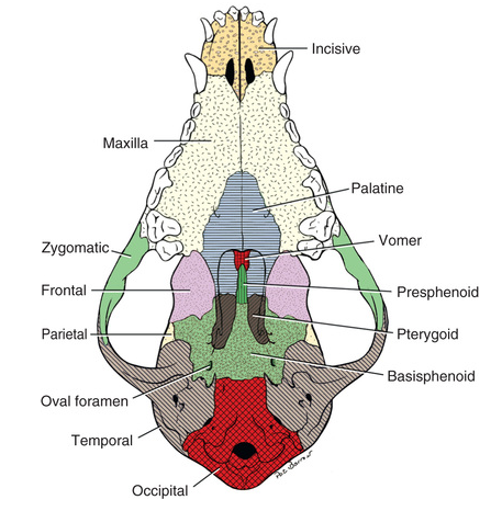Extends just caudal to last maxillary molar teeth in normal dogs