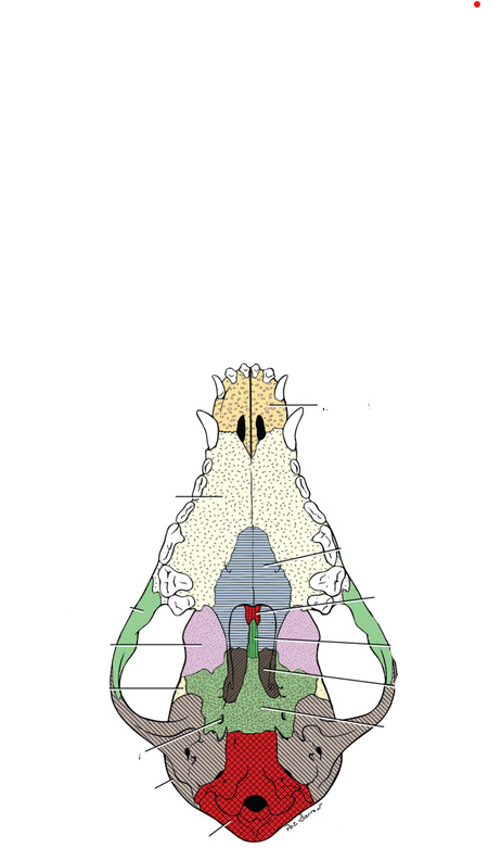 Extends just caudal to last maxillary molar teeth in normal dogs