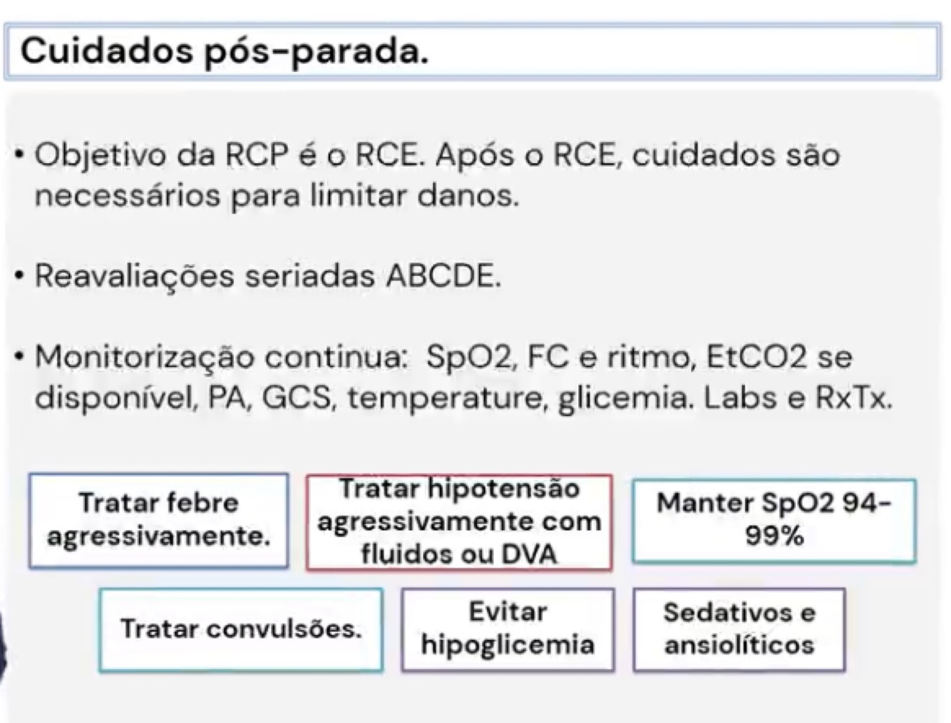 Quais as principais ações no pós parada, após retorno da circulação espontânea?