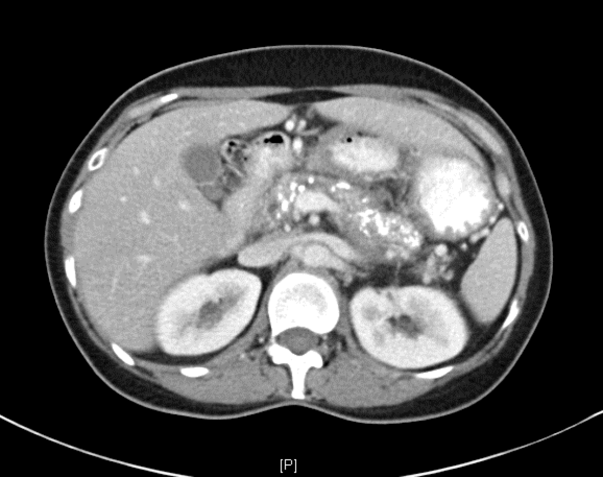 A 77-year-old man with a history of ischemic cardiomyopathy (LVEF 20-25%) with an implantable cardioverter-defibrillator and compensated alcoholic cirrhosis presented with acute-onset right upper quadrant abdominal pain and fevers with chills. The patient was admitted to the hospital after transabdominal ultrasound in the emergency department revealed cholelithiasis, gallbladder wall thickening, and positive sonographic Murphy’s sign. Antimicrobial therapy was begun using piperacillin-tazobactam. On day 2 of hospitalization, the patient was transferred to the intensive care unit after development of sustained hypotension requiring initiation of norepinephrine infusion.