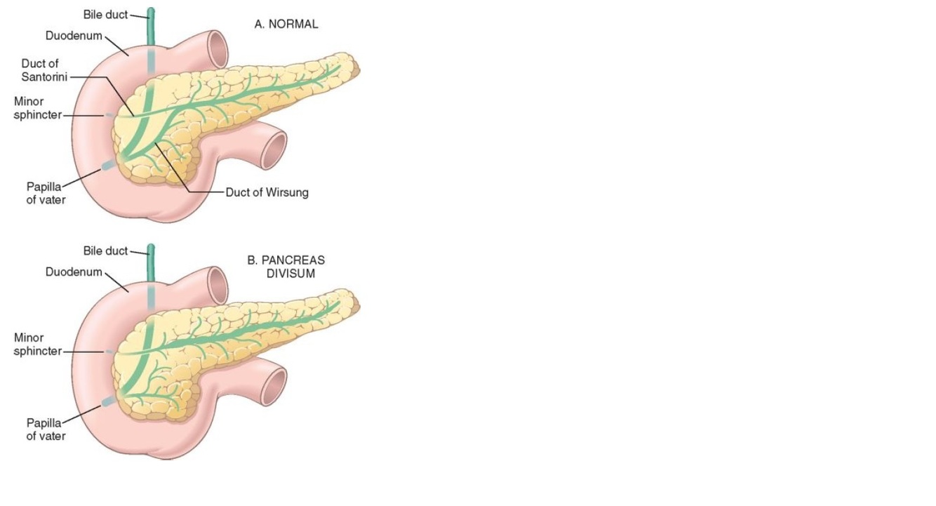 The duct of Wirsung in persons with this condition, normally the main pancreatic duct, is very short (1 to 2 cm) and drains only a small portion of the head of the gland through the larger caliber major papilla of Vater.