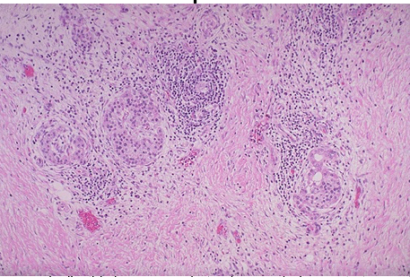 • Dense “duct-centric” inflammation of predominantly lymphoplasmacytic cells and expansion of periductal fibrous tissue