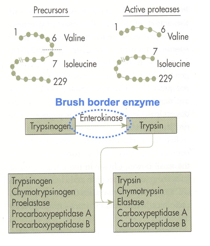 proenzymes & lysosomal proteases incorporated into same vesicles → trypsin activated
