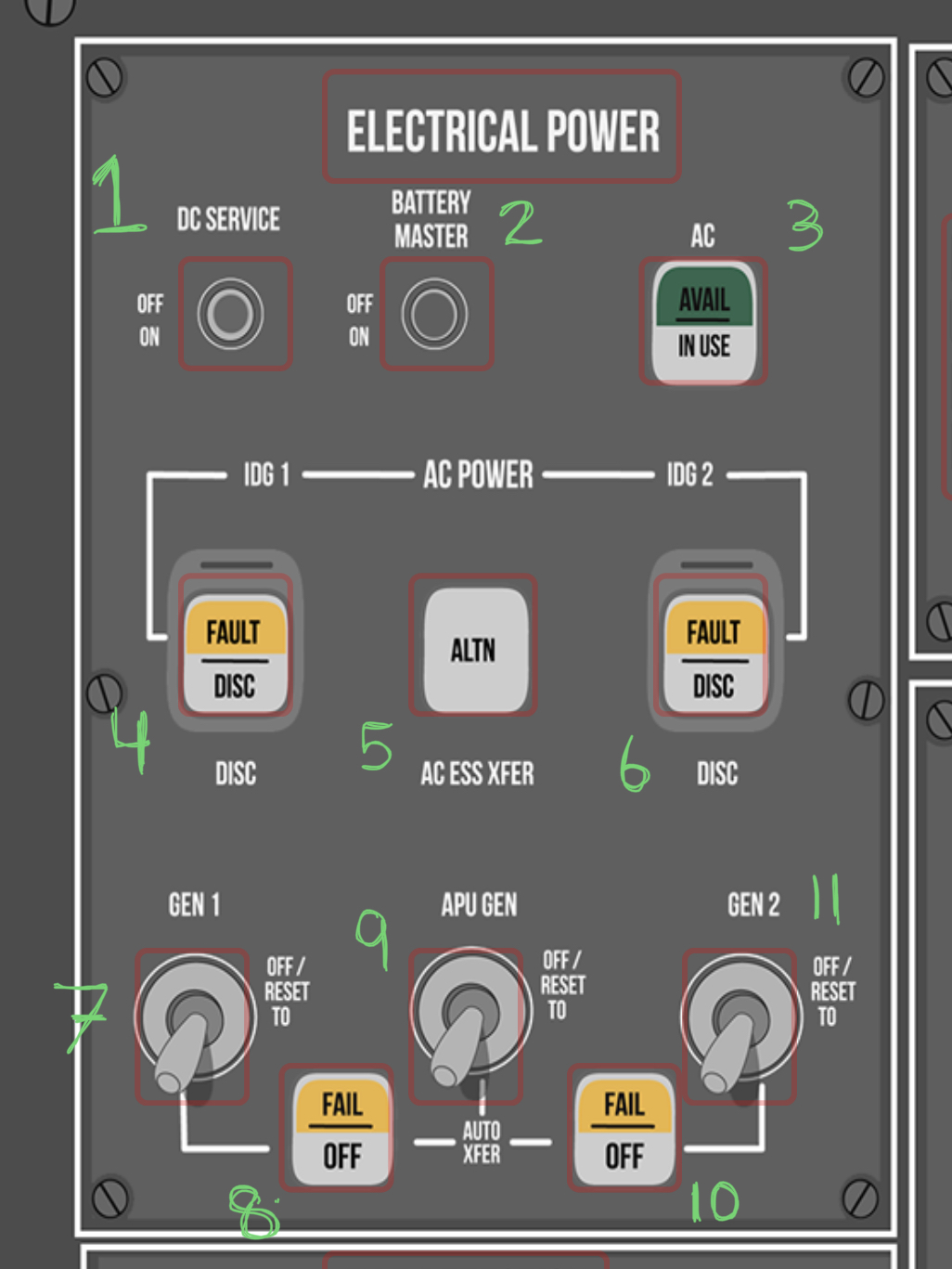 Number 2 is the battery master switch. Turning it on powers the APU BATTERY DIRECT BUS, the MAIN BATTERY DIRECT BUA, and DC battery bus which will turn on ED1 and ED2 among other things. It will allow your to power up the APU.