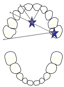Describe what it means if the patient’s canine is in front of the guide line and how this will impact the image.