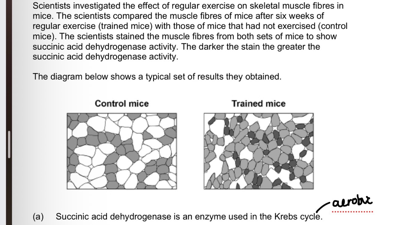 Scientists compared the length of of time that trained and untrained mice could carry out prolonged exercise. The trained mice were able to exercise for longer. Explain why (3 marks)