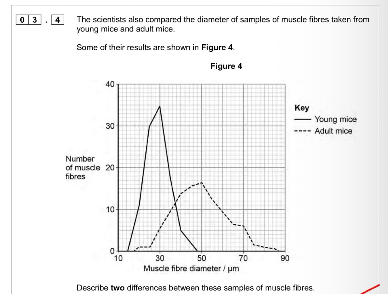 Adult fibres peak at a higher mode of 50 micrometres whereas young fibres peak at a mode of 30micrometres.