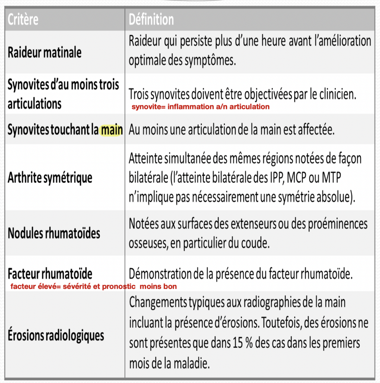 Présence du facteur rhumatoïde (surtout à titre élevé) ou taux d’anti-CCP élevé;