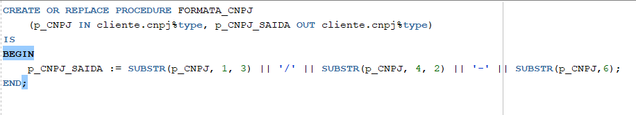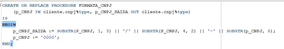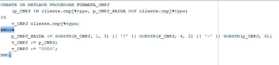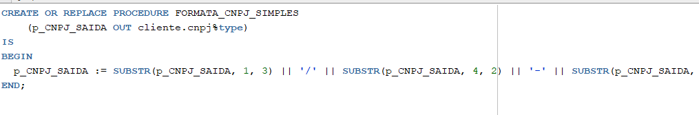 O resultado é atribuído ao parâmetro p_CNPJ_SAIDA, que é um parâmetro OUT e, portanto, retorna o valor formatado para quem chamou a procedure.