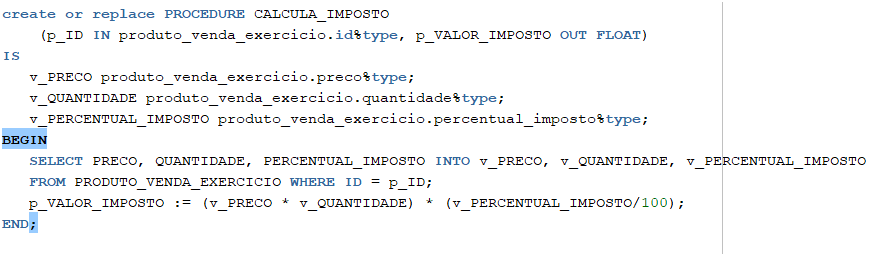 Crie uma procedure que, dado um identificador da venda (ID ), da tabela PRODUTO_VENDA_EXERCICIO, temos como retorno o valor financeiro do imposto. O parâmetro referente ao resultado do imposto deve ser passado para essa procedure como um parâmetro OUT.